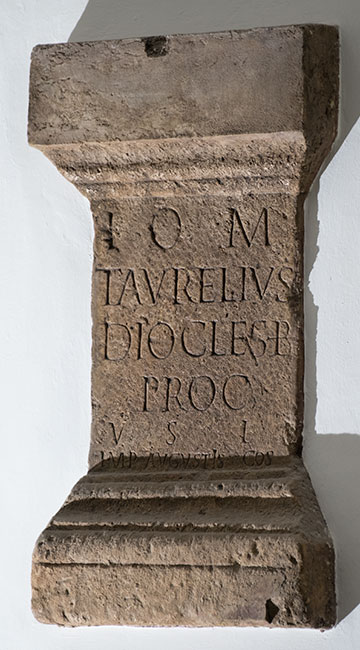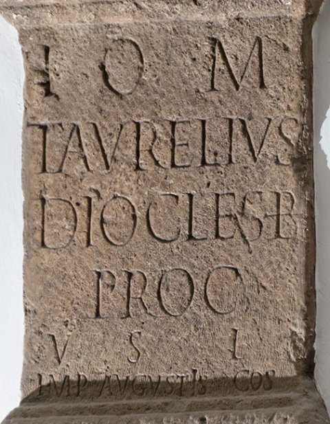 - I(ovi) o(ptimo) m(aximo) / T(itus) Aurelius / Diocles b(eneficiarius) / proc(uratoris) / v(otum) s(olvit) l(ibens) / Imp(eratoribus) Augustis co(n)s(ulibus)