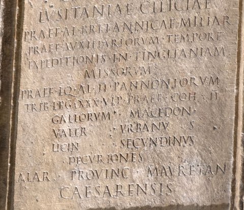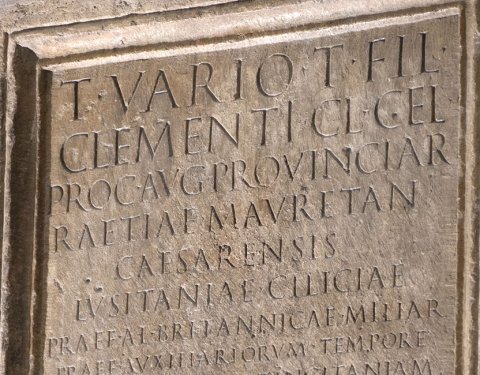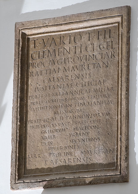 - T(ito) Vario T(iti) fil(io) / Clementi Cl(audia) Cel(eia) / proc(uratori) Aug(usti) provinciar(um) / Raetiae Mauretan(iae) / Caesarensis / Lusitaniae Ciliciae / praef(ecto) al(ae) Britannicae miliar(iae) / praef(ecto) auxiliariorum tempore / expeditionis in Tingitaniam / missorum / praef(ecto) eq(uitum) al(ae) II Pannoniorum / trib(uno) leg(ionis) XXX Ulp(iae) praef(ecto) coh(ortis) II / Gallorum Macedon(icae) / Valer(ius) Urbanus / Licin(ius) Secundinus / decuriones / alar(ii) provinc(iae) Mauretan(iae) / Caesarensis