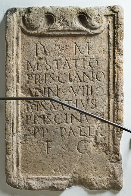 - D(is) M(anibus) / M(arco) Statio / Prisciano / ann(orum) VIII / M(arcus) Statius / Priscianus / p(rimus) p(ilus) pater / f(aciendum) c(uravit)