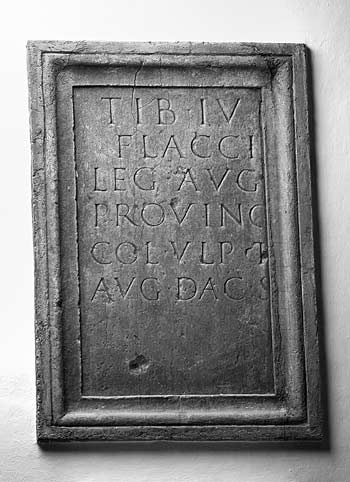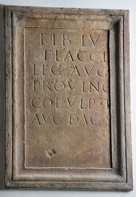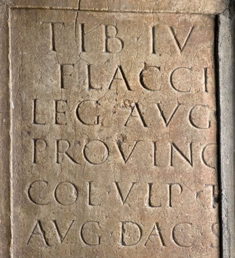 - Tib(erio) Iul[io] / Flacci[no] / leg(ato) Aug(usti) [pr(o) pr(aetore)] / provinc[iae Dac(iae)] / col(onia) Ulp(ia) T[rai(ana)] / Aug(usta) Dac(ica) S[arm(izegetusa)]