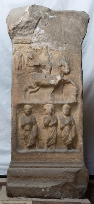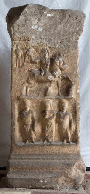 - Zwei Relieffelder übereinander. Oben Reiterheros nach rechts, in der linken oberen Ecke kleine stehende, nackte männliche Figur. Unten drei frontal stehende Personen (Frau zwischen zwei Männern).