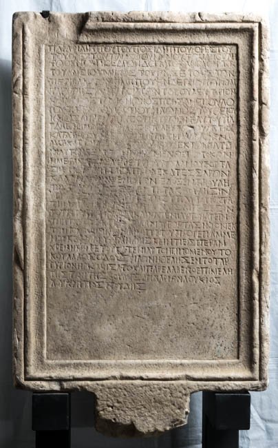 - griechisch: παρὰ Φιλίππου τοῦ Ποσιδίππου, Ὀρέστου / τοῦ Ὀρέστου, Π<α>ραμόνου τοῦ Μ<ι>κίνου, τῶν ἀποκλη/ρωθέντων προέδρων, δόγματος ἀναγραφή· τῇ κα̣ʹ/τοῦ Δαισίου μηνὸς τοῦ γμσ ἔτους· τῶν / περὶ Βάρβαρον Φιλίππου ἐν Δερριόπῳ πολι/ταρχῶν συναγαγόντων τὸ βουλευτήριον / κὲ Φίλωνος τοῦ Κόνωνος ποησαμένου λό/γους περ<ὶ> Μ(άρκου) Οὐεττίου Φίλωνος τοῦ θείου / κὲ προσανγείλαντος ὅτι κὲ πρῴ<η>ν τὴν ἑαυτοῦ πα/τρ<ί>δα ἐτείμησε μεγάλως κὲ τελευτῶν οὐδὲ τῆς / κατὰ τὴν βουλὴν τε<ι>μῆς ἠμέλησεν, ἀλλ’ ἀφῆκεν / αὐτῇ κατὰ διαθήκην δ(ηνάρια) ͵αφʹ, ἐφ’ ᾧ ἐκ τῶν κατ’ ἐ/νιαυτὸν ἐξ αὐτῶν γεινομένων vac. τόκων / ἡμέραν ἄγουσα Οὐεττίου Βωλανοῦ ἑορτά/σιμον εὐωχῆται τῇ πρὸ δεκατεσσάρων / καλανδῶν Νοεμβρίων· ἔδοξεν τῇ βουλῇ / τὴν τοῦ ἀνδρὸς σεμνότητα κὲ βούλησιν / ἀποδέξασθαι ἐπί τε ταῖς ὑπ’ αὐτοῦ κατὰ / τὴν διαθήκην γεγραμμέναις αἱρέσεσιν,/ τὸ τ’ ἀργύριον λαβεῖν καὶ κατ’ ἐνιαυτὸν ἄγειν / τὴν τοῦ Οὐεττίου Βωλανοῦ ἑορτάσιμον ἐκ / τῶν τόκωνἡμέραν καὶ μήτε τοῦ προγεγραμμέ/νου κεφαλαίου ἀπαναλίσκειν τι εἰς ἑτέραν / χρείαν μήτε τοῦ κατ’ ἐνιαυτὸν γινομένου τό/κου, ἀλλ’ ὡς ὁ δοὺς Φίλων ἠθέλησεν· τό τ’ ἀρ/γύριον ἠριθμήσατο καὶ παρέλαβεν ὁ ἐπιμελη/τὴς τῶν τῆς βουλῆς δηναρίων Λούκιος / Λουκρήτιος Πούδης.