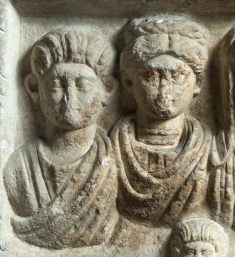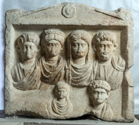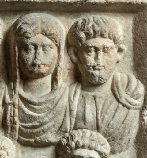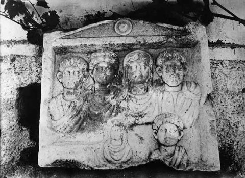 Im Hauptbild Familie : Brustbilder von vier Erwachsenen und Büsten von zwei Kindern. Von links: Jüngling, bartlos, Tunica, Mantel. Frau (Tochter) mit Haarkrone, Mantel. Frau (Mutter) mit Mittelscheitel, Mantel über dem Kopf. Mann (Vater), bärtig, Mantelbausch auf der linken Schulter. Vorn unten Büsten eines Mädchens und eines Knaben.