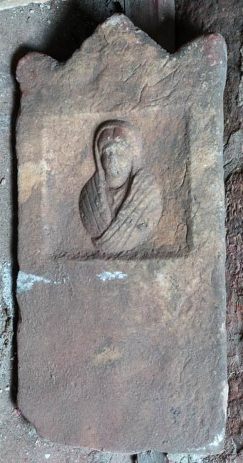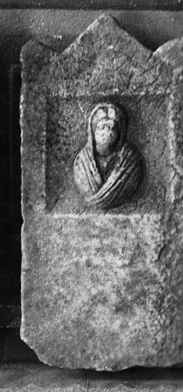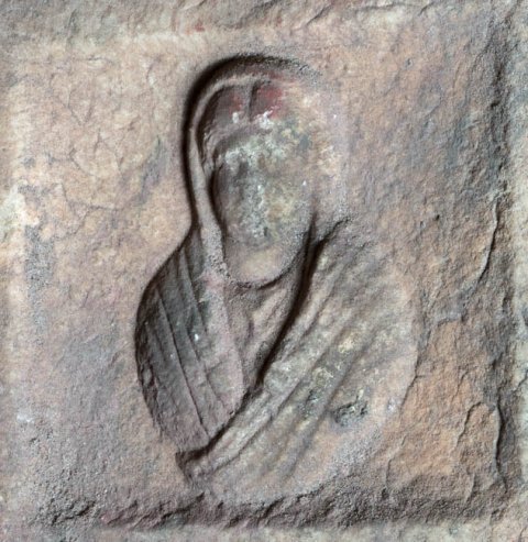 Darunter Rechtecknische mit Büste einer Frau mit Mittelscheitel, Mantel über den Kopf gezogen.