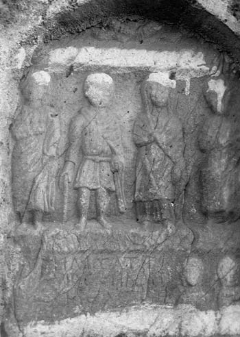 Im Hauptbild Familie: vier stehende Ganzfiguren. Von links: Mann im Mantel. Mann in kurzer Ärmeltunica mit Gürtel mit Ringschnalle, Sagum, in der Rechten Stock. Frau mit über den Kopf gezogenem Mantel. Mann im Mantel.