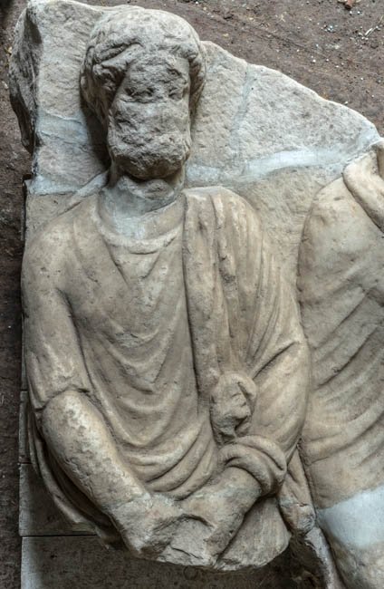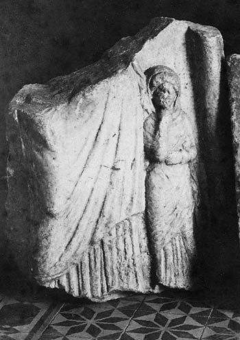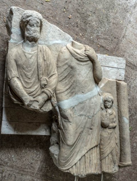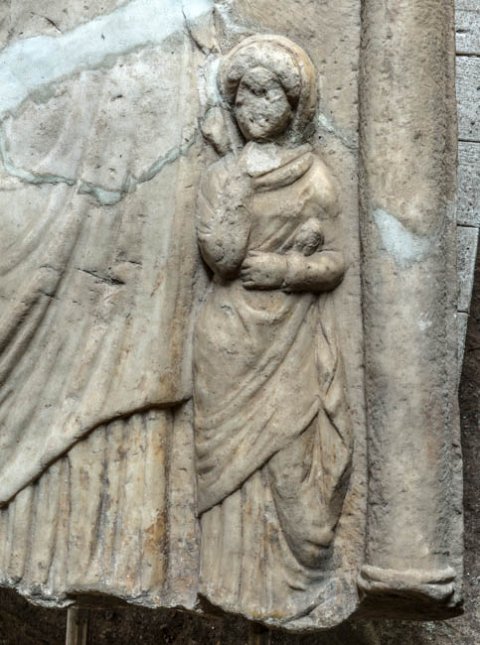 - Bildfeld, flankiert von Säulen. Drei stehende Personen: bärtiger Mann in Ärmeltunica und Mantel, Frau im Mantel, rechts kleine weibliche Figur mit über den Kopf gezogenem Mantel und Puppe (?) im Arm (Tochter).