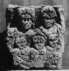 - Familie: Brustbilder eines Ehepaares mit drei Kindern. Links Frau, rechts Mann mit Sagum und Scheibenfibel, vorn Kinder (links Mädchen ?, rechts zwei Knaben im Sagum ?).