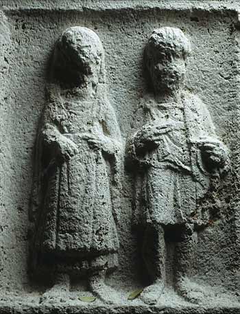 Im Hauptbild zwischen Säulen zwei Ganzfiguren (Ehepaar). Links einheimische Frau: Schleier, Unter- und Obergewand, Flügelfibeln, Armbänder, Spindel. Rechts Mann: kurze Tunica, Sagum, in der Linken Rolle (volumen).