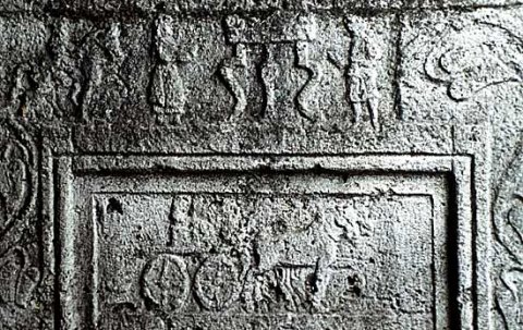 Im Zwischenbild Totenopfer, Reiter: dreibeiniger Tisch mit Speisen, links Dienerin, rechts Diener. Hinter der Dienerin Reiter.