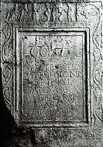 - Tertio / Noibionis / f(ilio) ann(orum) XL / Satimara / Atresi (filia) / mar(ito) caro / et s(i)bi viva f(aciendum) c(uravit)