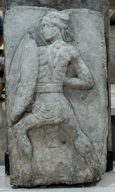 - Gladiator mit Gürtel in Rückenansicht nach links. Waffen: Helm, Ovalschild, Schwert. Siehe auch Nr. 6819.