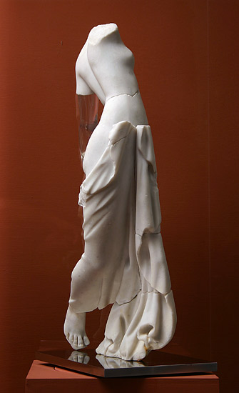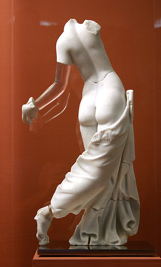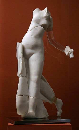 - Mythische Figur : tanzende nackte Mänade in Drehbewegung, rechter Arm war erhoben, der linke zur Seite gestreckt. Der herabgeglittene Mantel bedeckt nur das rechte Bein.