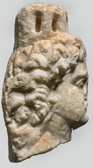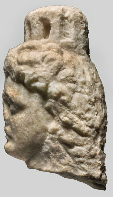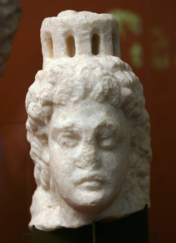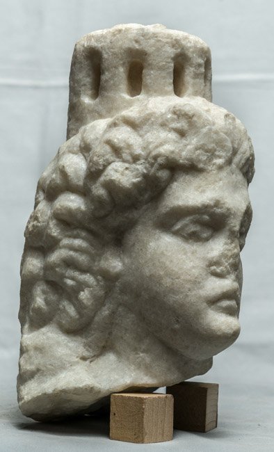 - Mythische Figur (Genius) : Jünglingskopf mit langen Locken und Mauerkrone.