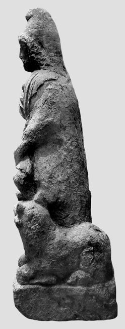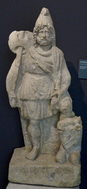 - Mythische Figur: Jupiter Dolichenus mit langen gelockten Haaren und Vollbart, in kurzem gegürteten Ärmelgewand, Mantel, phrygischer Mütze und Sandalen. In der Rechten Doppelaxt, in der Linken Blitzbündel. Der linke Fuß ist auf den neben ihm liegenden Stier gestellt.