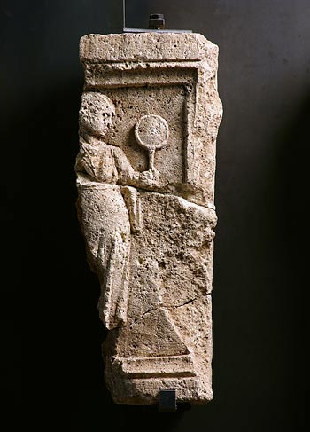 - Dienerin: in gerahmtem Rechteckfeld nach rechts gewandtes Mädchen mit rundem Griffspiegel in der Linken.