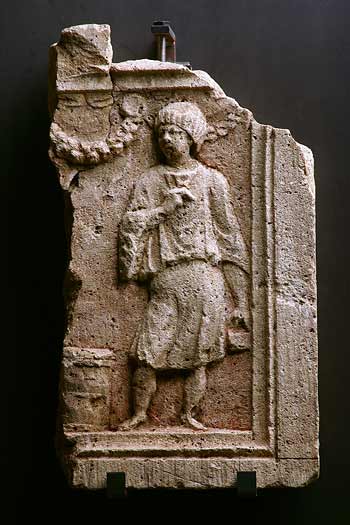 - Diener (Librarius - Scriba): in gerahmtem Rechteckfeld nach links gewandter Mann in kurzer gegürteter Ärmeltunica, in der Linken zusammengeklapttes Polyptychen, vor dem rechten Fuß Rollenbehälter. Vom oberen Rahmen hängende Girlande.