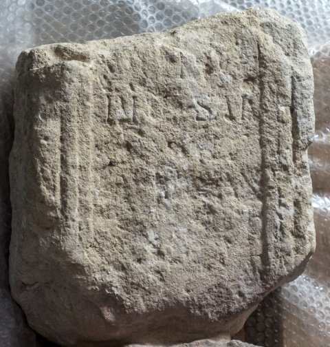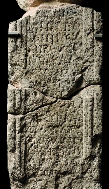 - zerbrochen, oben abgebr., stark verwittert, Inschrift tlw. eradiert