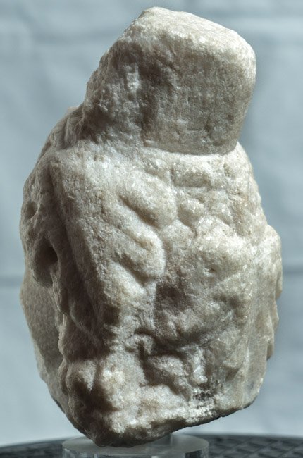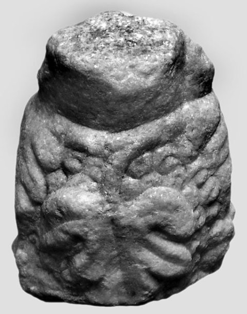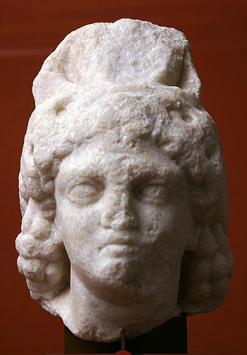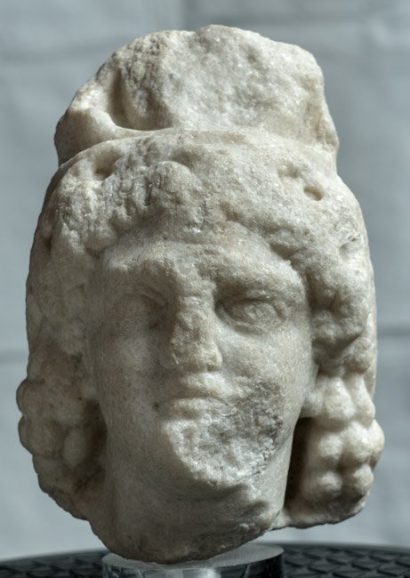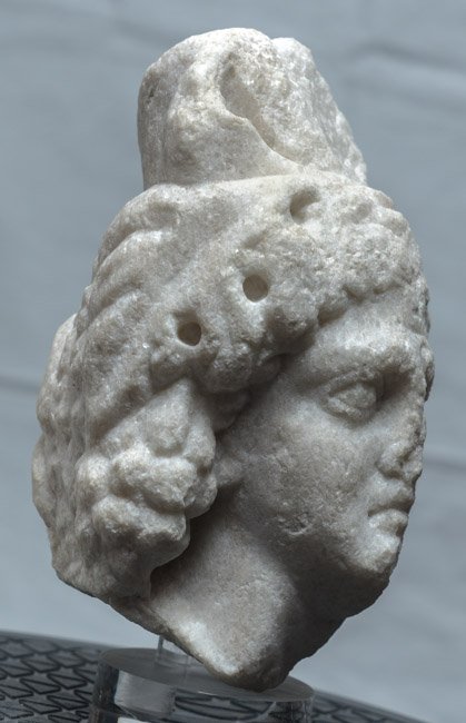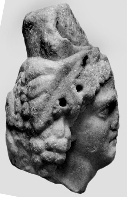- Mythische Figur (Dionysos-Bacchus): Jugendlicher Kopf mit Krone (Polos), Weinlaub und seitlich herabhängenden Trauben. Bohrlöcher für Metallverzierung.