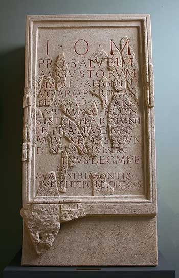 - [I(ovi) O(ptimo)] M(aximo) / [pr]o [sa]lute Imp(eratorum) / Augu[sto]rum / M(arci) Aur[el(i) A]ntonini / Aug(usti) [Arm(eniaci) P]art(hici) max(imi) / et L(uci) A[u]r(eli) Ve[ri A]ug(usti) Arm(eniaci) / Pa[rt(hici)] max(imi) c(ives) R(omani) con/sis[t]ent(es) Ka[r]nunt[i] / intra leugam p[r(imam?)] / M(arcus) Iu[l(ius)] Serg(ia) Secu[n]/[di]nus et C(aius) Iu[l(ius) Serg(ia)] / [---]inus d[ec(uriones) m(unicipii) K(arnunti?) et] / [---]nu[s ---] / magi[stri] mo[ntis] / [P]ude[nte et P]ollio[ne co(n)s(ulibus)]