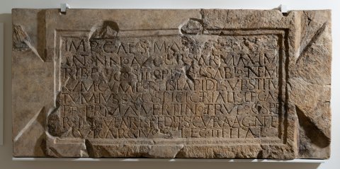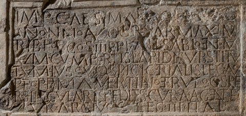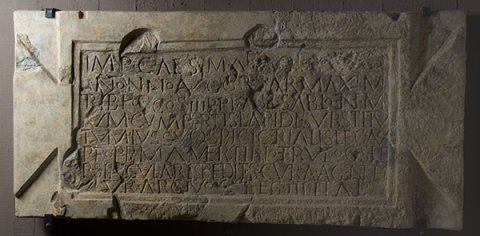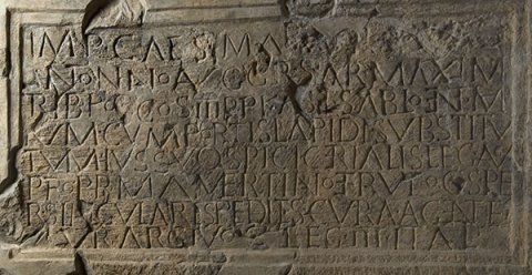 - Imp(eratori) Caes(ari) [[M(arco) Aur(elio) Commodo]] / Antonino Aug(usto) Ger(manico) Sar(matico) maximo / trib(unicia) pot(estate) co(n)s(uli) III p(atri) p(atriae) kaste(llo) Sablonet(o) mu/rum cum portis lapidi(bus) substitu/tum iussu Q(uinti) Spici Cerialis leg(ati) Aug(usti) / pro pr(aetore) Mamertino et Rufo co(n)s(ulibus) pe/r singulares pedites cura agente / Aur(elio) Argivo c(enturione) leg(ioni) III Ital(icae)