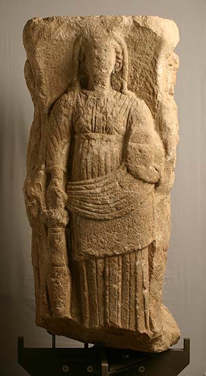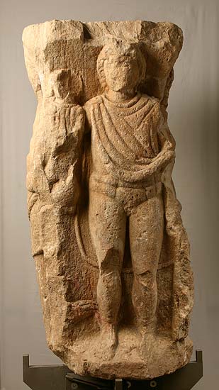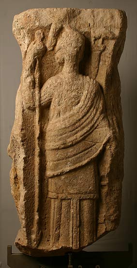 - Mythische Figur ( Juno, Minerva, Hercules, Mercur). Juno: gegürtetes Ärmelkleid, Mantel, Schleier, in der Linken offenes Kästchen, die Rechte über balusterförmigem Altar mit Flammen. Minerva: Helm mit Helmbusch, langes Gewand und Mantel, die Linke auf dem Schildrand, in der erhobenen Rechten Lanze, über der linken Schulter Pfeiler mit Eule. Mercur: nackt bis auf den auf der rechten Schulter zusammengehaltenen Mantel, Flügelschuhe. Im linken Arm Caduceus (verbrochen), in der Rechten Geldbeutel, auf dem rechten Arm bekleidete Büste ? (Rosmerta ?) oder Bacchuskind ?. Neben dem rechten Fuß Hahn. Hercules: nackt, Löwenfell über dem linken Arm, die Rechte auf der Keule.
