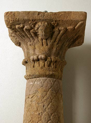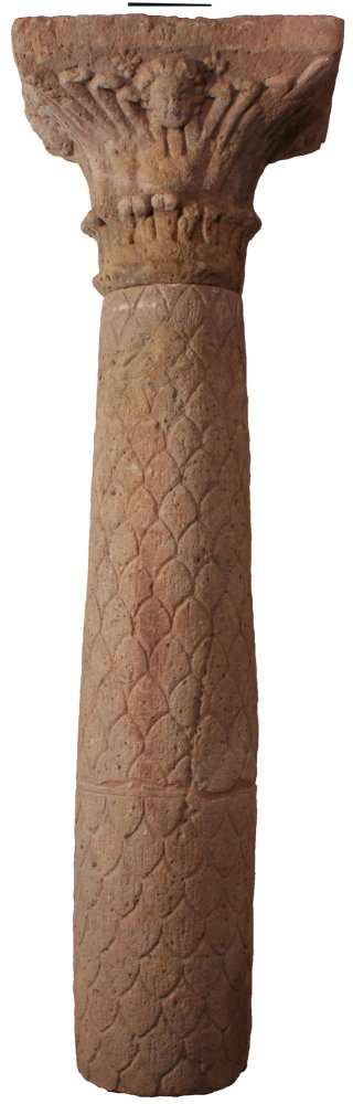 - Geschuppter Säulenschaft. Kapitell mit zwei Blattkränzen und vier Köpfen (Jahreszeiten).