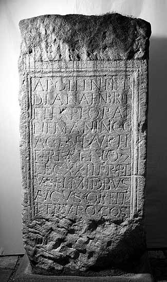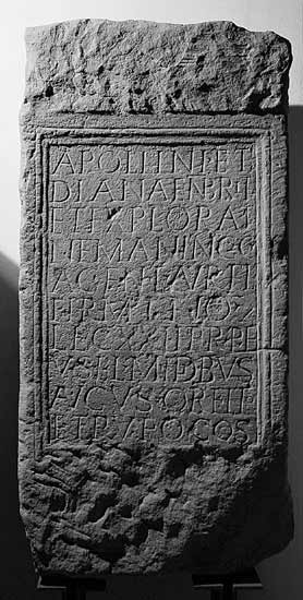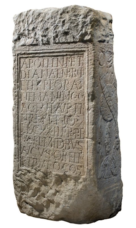 - Apollini et / Dianae n(umerus) Brit(tonum) / et explorat(ores) / Nemaning(enses) c(uram) / agen(te) T(ito) Aurel(io) / Firmino |(centurione) / leg(ionis) XXII Pr(imigeniae) p(iae) f(idelis) / v(otum) s(olverunt) l(ibentes) l(aeti) m(erito) Idibus / Augus(tis) Orfito / et Rufo co(n)s(ulibus)
