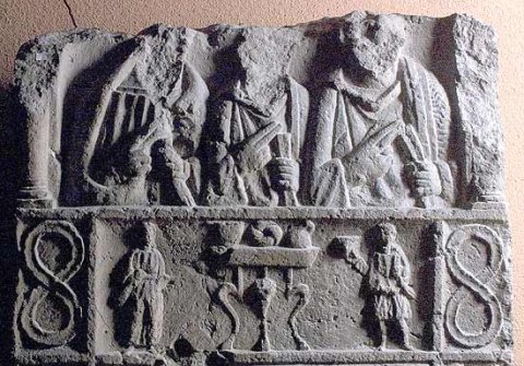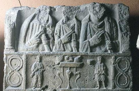 Im Hauptbild zwischen Säulen drei Brustbilder einer Familie. Links Frau: Tunica, Mantel, in der Linken Rolle (volumen). In der MItte Mann: Ärmeltunica, Sagum, Scheibenfibel, in der Linken Rolle. Rechts Mann: Ärmeltunica, Sagum mit Fransen, Scheibenfibel, in der Linken Rolle.
