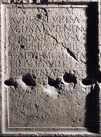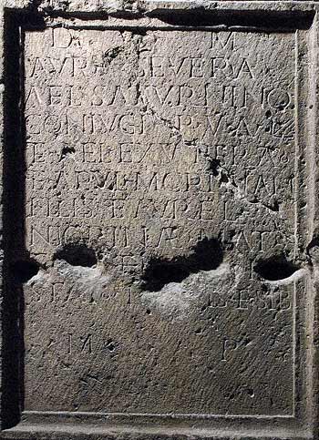 - D(is) M(anibus) / Aur(elia) Severa / Ael(io) Saturnino / coniugi p(iissimo) v(ixit) a(nnos) LXXX / et Ael(io) Ex(s)uperato / et Apul(eio) Macrinian(o) / filis et Aurel(iae) / Nigrinae mat(ri) / et [---]FI[---]M[---]/S et Ato[---]is et sib(i) / m(emoriam) p(osuit)