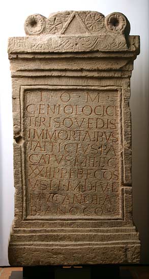 - I(ovi) o(ptimo) m(aximo) / Genio loci ce/terisque dis / immortalibus / T(itus) Atticius Pa/catus mil(es) leg(ionis) / XXII P(rimigeniae) p(iae) f(idelis) b(ene)f(iciarius) co(n)s(ularis) / v(otum) s(olvit) l(ibens) l(aetus) m(erito) Id(ibus) Iul(iis) / Muciano et Fa/biano co(n)s(ulibus)
