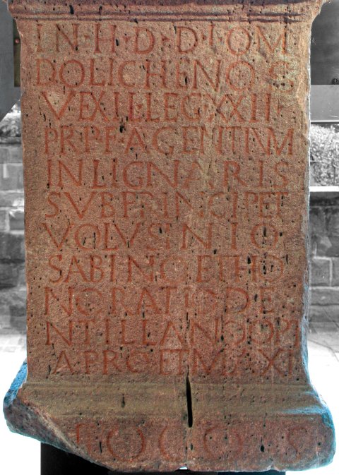 - In h(onorem) d(omus) d(ivinae) I(ovi) O(ptimo) M(aximo) / Dolicheno s(acrum) / vexil(latio) leg(ionis) XXII / Pr(imigeniae) p(iae) f(idelis) agentium / in lignari(i)s / sub principe P(ublio)(?) / Volusinio / Sabino et T(ito) Ho/noratio De/ntiliano opt(ione) / Apro et Maxi/mo co(n)s(ulibus)