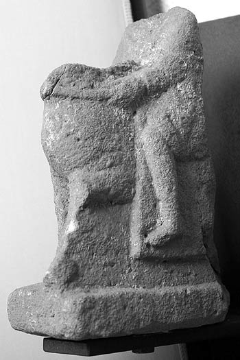 - Reiter in kurzer Ärmeltunica und Hosen (?) auf gezäumtem Pferd mit Satteldecke und erhobenem Vorderbein.