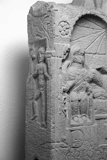 Auf der linken Nebenseite in Bogennische stehender nackter Jüngling, der mit der Rechten eine runde Tafel mit Inschrift hält. In der Linken Speer. Über der Nische Vogel.