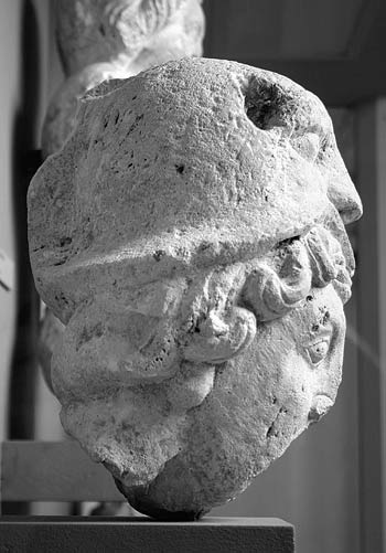 - Mythische Figur (Heros ? Mars ?) : bartloser Kopf mit gelocktem Haar und nach oben geschobenem Gesichtshelm.