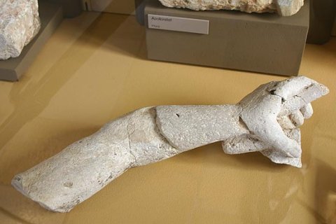 - Mythische Figur (Vulcanus) : linker Arm, in der Hand Griff einer Zange, darunter Rest einer Stütze (Amboss ?).