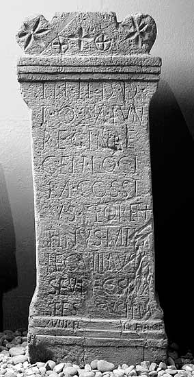 - In h(onorem) d(omus) d(ivinae) / I(ovi) O(ptimo) M(aximo) Iun(oni) / Reginae / Gen(io) loci / M(arcus) Cossi/us Floren/tinus mil(es) / leg(ionis) VIII Aug(ustae) / Sev(erianae) b(ene)f(iciarius) co(n)s(ularis) pro / se et su[is] v(otum) s(olvit) l(ibens) l(aetus) m(erito) // (ante diem) XVII K(alendas) Fe[b(ruarias) Maximo e]t Ael(iano) co(n)s(ulibus)