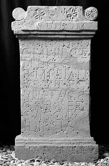 - [In] h(onorem) d(omus) d(ivinae) I(ovi) O(ptimo) M(aximo) // Iun(oni) R(eginae) d(is) d(eabus)q(ue) / omnib(us) Ge/n(io) loc(i) Cl(audius) / Pompeian/us mil(es) [l]eg(ionis) / VIII Ant(oninianae) Aug(ustae) b(ene)f(iciarius) / co(n)s(ularis) pro se et / suis o(mnibus) p(osuit) / Idibus Ia[n(uariis)] // [Gr]ato et Seleu/co co(n)s(ulibus)