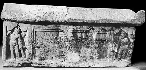 - Gerahmtes Schriftfeld zwischen Bogennischen mit nackten geflügelten Knaben mit gesenkter Fackel (Trauergenius).