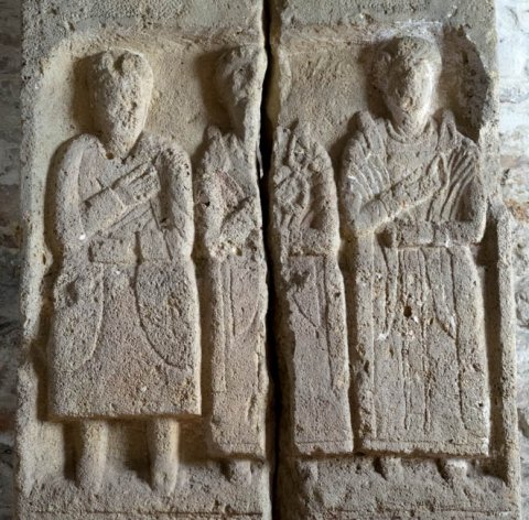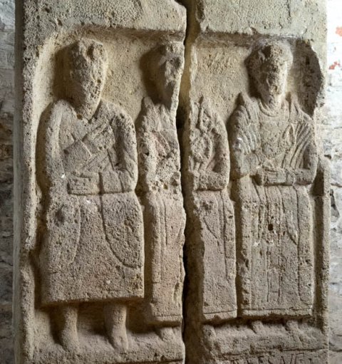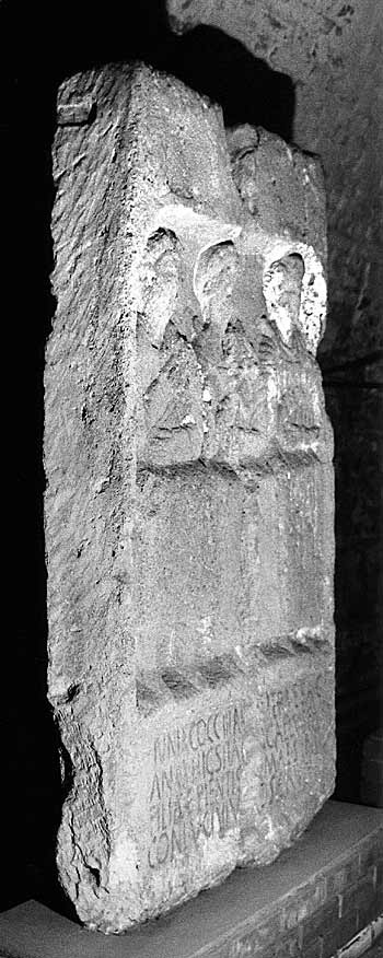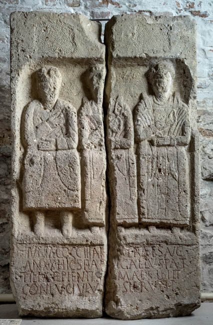 - Familie: drei sitzende Ganzfiguren. Links Mann: Ärmeltunica, Umhang. In der Mitte und rechts einheimische Frau: Ober- und Untergewand, Gürtel, Umhang, Flügelfibeln, Halsreif, Armbänder.