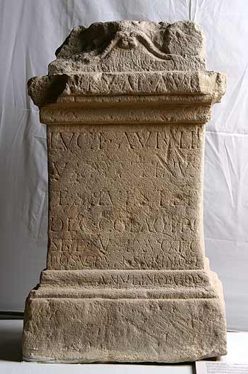 - [Mine]rvae Aug(ustae) // Luci(i) Aurelii / Valentinus / et Silvester / dec(uriones) col(oniae) Aq(uincensis) pro / se et suis ex voto / posuerunt Sabino et // Anulino co(n)s(ulibus)