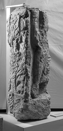 - Eckblock: auf der Vorderseite nach rechts ausschreitender bekleideter Mann. Auf der linken Nebenseite Ornament.