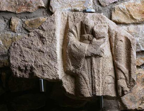 - Mythische Figur (Hygieia ?) : Auf der Vorderseite frontal stehende Frau in gegürteter Ärmeltunica, in der Linken Trinkgefäß, um den herabhängenden rechten Arm windet sich Schlange (?). Links glatte Randleiste, rechts schmale Leiste. Auf der rechten Nebenseite Reliefreste (Ranken ?).
