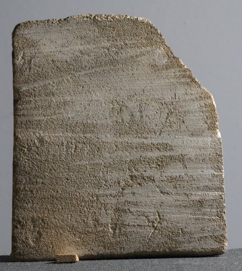 - links oben abgebr., bestoßen, Rückseite abgesägt, rote Farbe in den Buchstaben