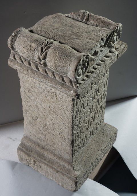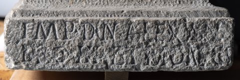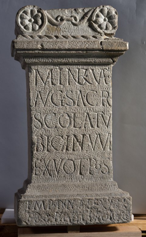 - Minervae / Aug(ustae) sacr(um) / sc(h)ola tu/bicinum / ex vot(o) pos(uit) // Imp(eratore) d(omino) n(ostro) Alexan/dro III et Dione co(n)s(ulibus)