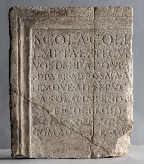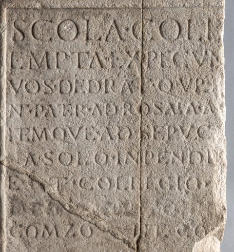 - Sc(h)ola coll[egii] / empta ex pecun(ia) [quam vi]/vos dederat Q(uintus) Ulp(ius) F[elix(?) p(raefectus) ce]/nt(onariorum) pater ad rosalia(s) an[nua(?)] / itemque ad sepulc[hrum] / a solo inpendio [eius fac(iendum?)] / et collegio [ded(icata?)] / [[[Imp(eratore) Antonin]o [Au]g(usto) III]]] / et Com(a)zonte co(n)s(ulibus)
