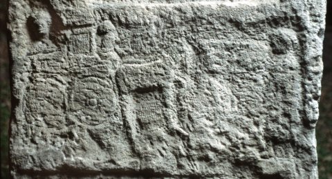 Im Hauptbild einheimische Frau: in eckiger Nische Brustbild mit Haube, Schleier, Flügelfibeln, Torques, Armbänder, in der Rechten länglicher Gegenstand (Spindel ?).