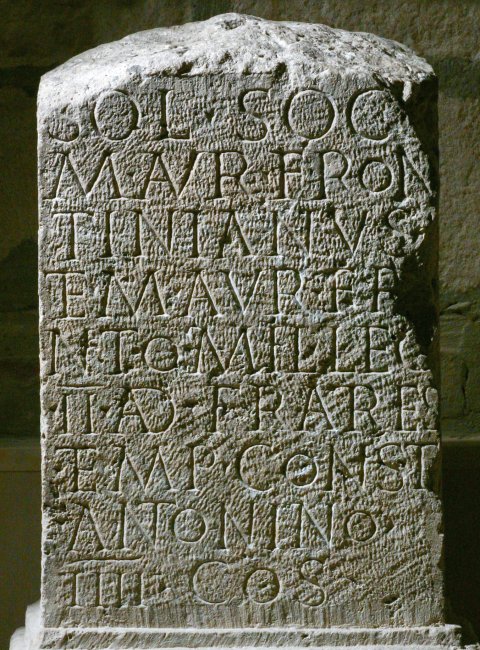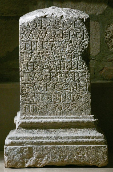 - Sol(i) soc(io) / M(arcus) Aur(elius) Fron/tinianus / et M(arcus) Aur(elius) Fro/nto mil(ites) leg(ionis) II Ad(iutricis) fratres / templ(um) const(ituerunt) / Antonino IIII co(n)s(ule)