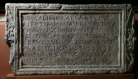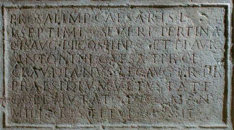 - Pro sal(ute) Imp(eratoris) Caesaris L(uci) / {P(ubli)} Septimi Severi Pertina/cis Aug(usti) Pii co(n)s(ulis) II p(atris) p(atriae) et M(arci) Aur(eli) / Antonini Caesa(ris) Tib(erius) Cl(audius) / Claudianus leg(atus) Aug(usti) pr(o) pr(aetore) / praesidium vetustate / coll(apsum) mutato loco manu / milit(um) restitui iussit