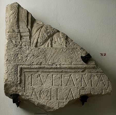 - Iulia Matr[ona?] / Acuilaes(!) f(ilia) [an(norum) ---] / [h(ic)] s(ita) [e(st)] / [---