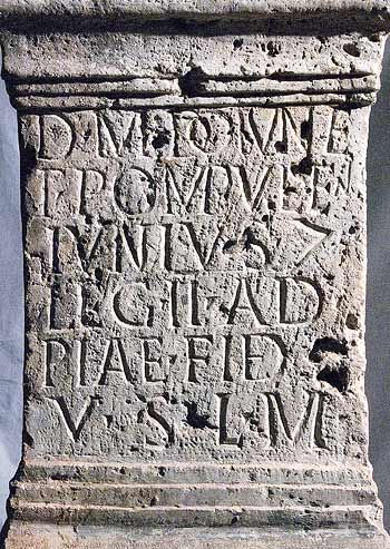 - Dom(no) Domn(a)e) / T(itus) Pompuleni(us) / Iunius (centurio) / leg(ionis) II Ad(iutricis) piae fide(lis) / v(otum) s(olvit) l(ibens) m(erito)